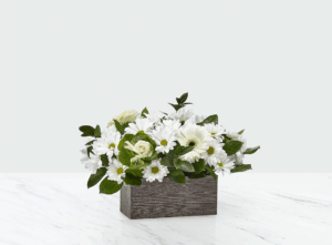 Present Mom with a lovely box of rustic charm with the Home Sweet Home bouquet. Crisp white blooms of gerbera daisies and daisy poms mix beautifully with deep green ornamental kale greens. The arrangement is then placed in a vase made to look like a weathered wooden box. It’s a clean and simple feel-good bouquet that is sure to fit well in any home! And it’s hand-delivered by a local florist, for that special gift-giving moment.