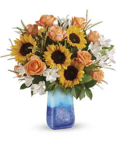 Another way to brighten Mom’s day is this bouquet full of sunshine. This sunflower bouquet also features orange roses and white alstroemeria arranged among beautiful greens. Mom’s flowers are perfectly accented with a hand-blown art glass vase in shades of blue. The contrast of colors invokes the sunset over a tropical ocean. It’s a lovely presentation Mom is sure to appreciate.